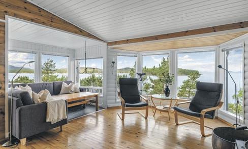 Koselig hytte med panoramautsikt mot sjøen. Hytten har stor tomt, strandlinje og naust.