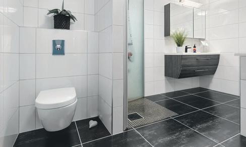 - Vaskerom med fliser på gulvet. OSO plus plus varmtvannsbereder med varmepumpe.