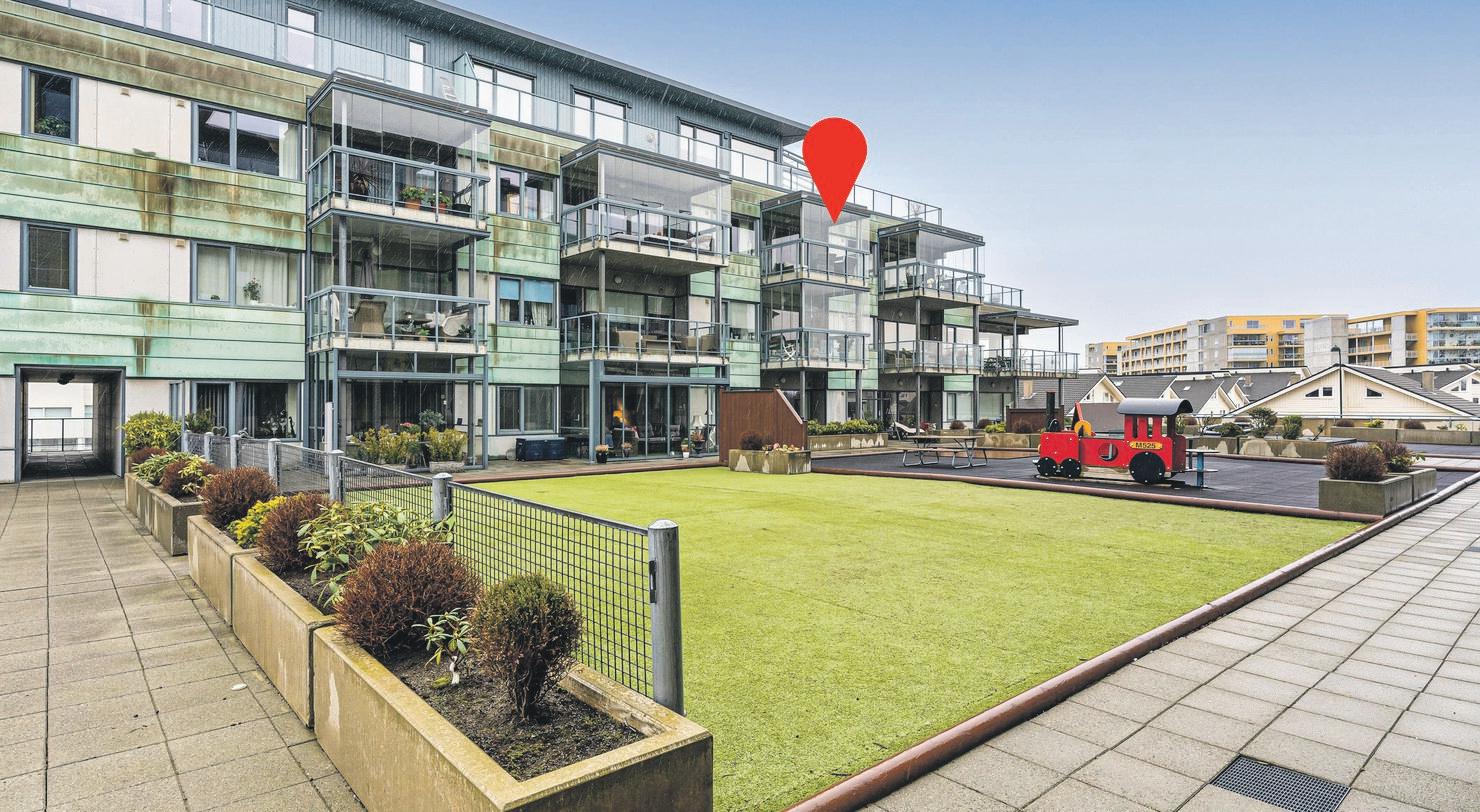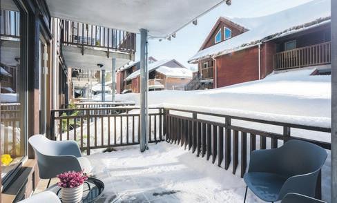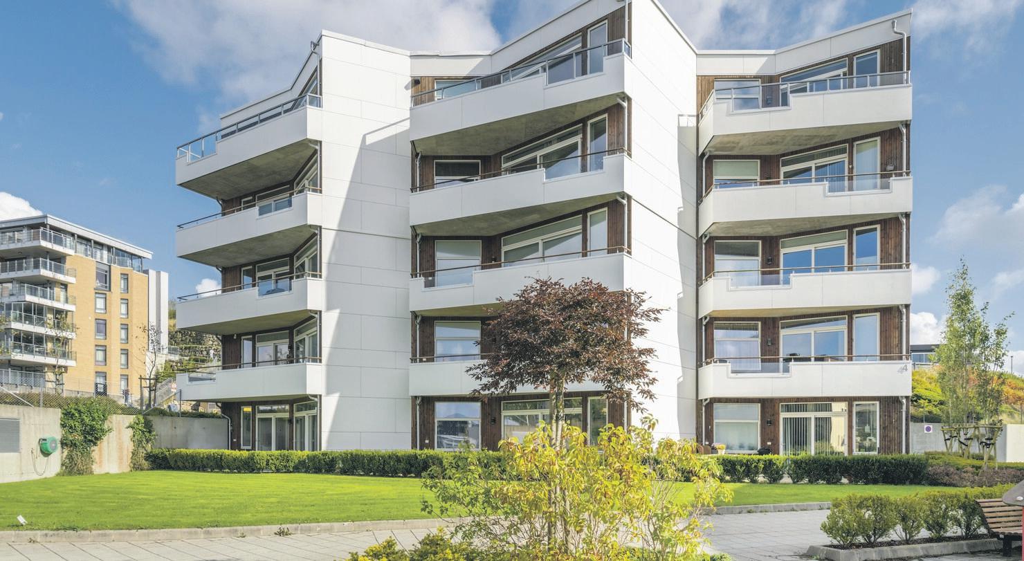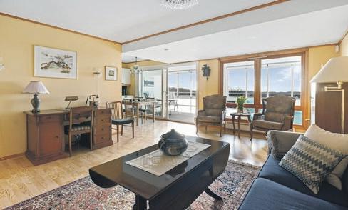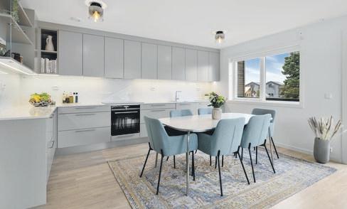 Stuen har store vindusflater som gir godt lys-innslipp. Kjøkken i eik med åpen løsning og god plass til spisebord. Flislagt bad er nøytralt, og har skyvedører hvor vask/tørektrommel er plassert. Heis og garasjeplass i lukket anlegg.
