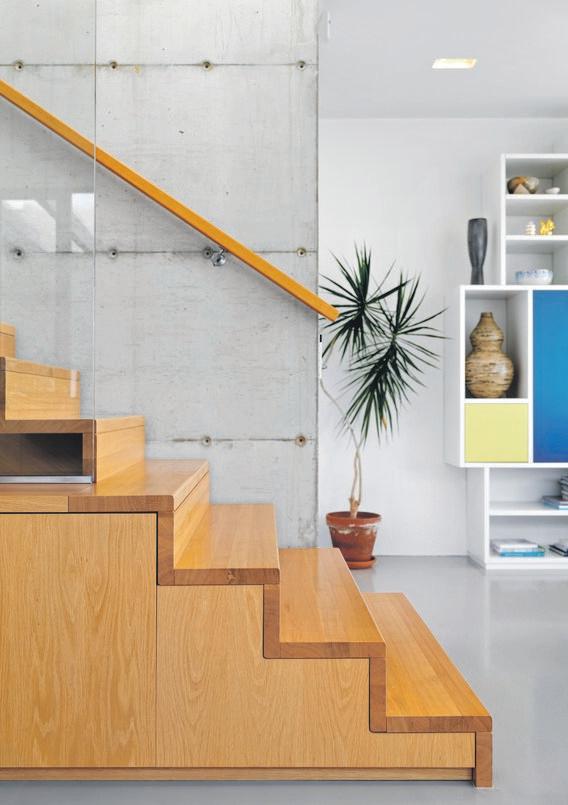 Den romslige og elegante stuen byr på lun stemning fra gasspeisen. En stedbygd hylle fra Bostil strekker seg oppover veggen, mens glassvegger og glassdører gir godt med utsikt, rikelig med lys og adgang til sørvendt terrasse. Det er likevel et smykke av en trapp i eik og glass, som stjeler oppmerksomheten.