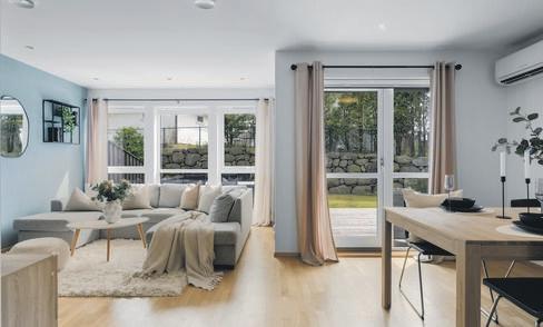 Lys og moderne leilighet på bakkeplan med attraktiv beliggenhet på Grødem. Gjennomgående med vinduer og egne uteområder i begge ender. Parkering i felles carport og utvendig bod.