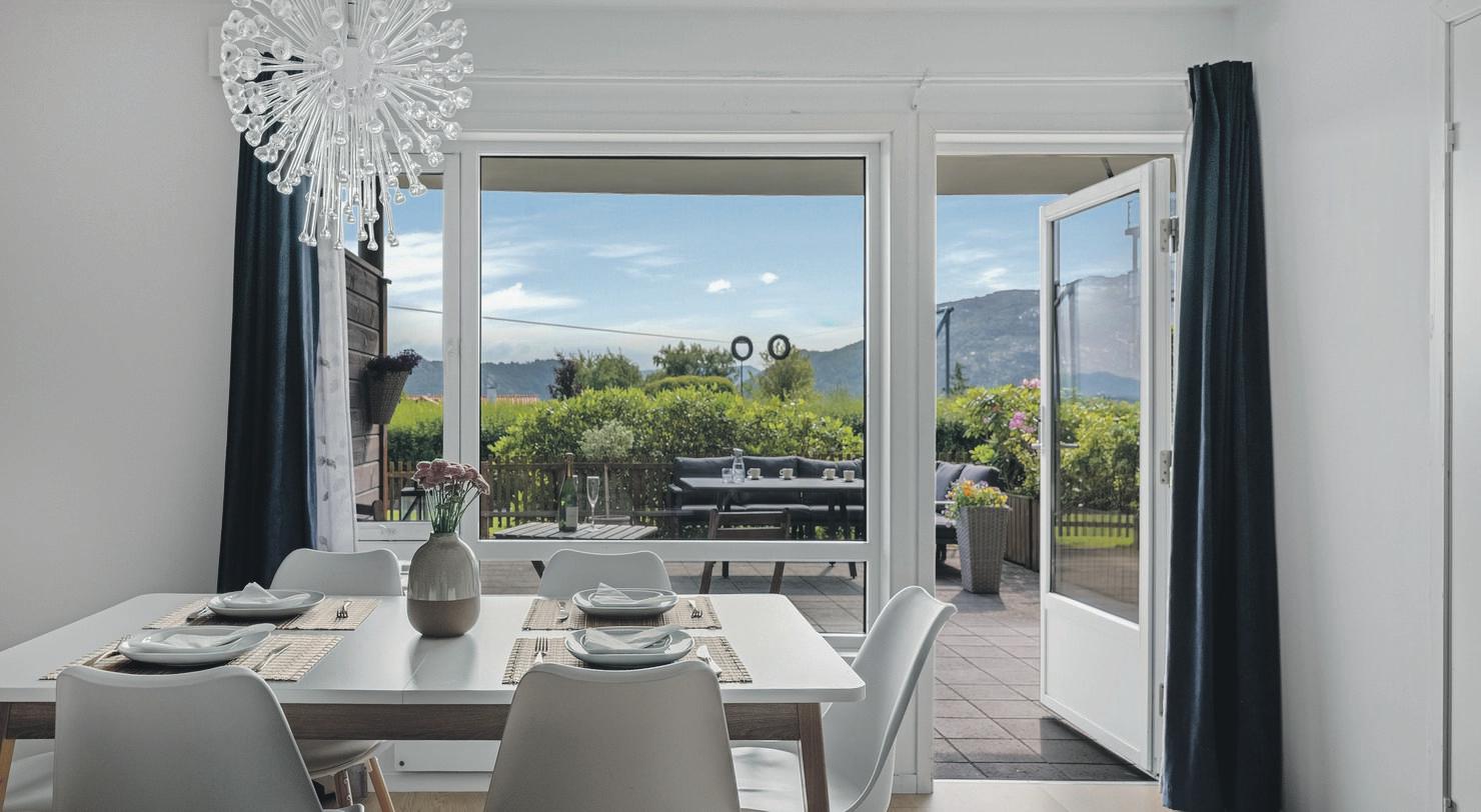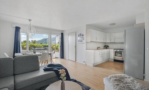 Attraktiv og velholdt gjennomgående leilighet med utsyn/utsikt mot fjord og fjell. Unik og stor terrasse. 2 soverom. Parkering i lukket anlegg. Heis og lett adkomst.
