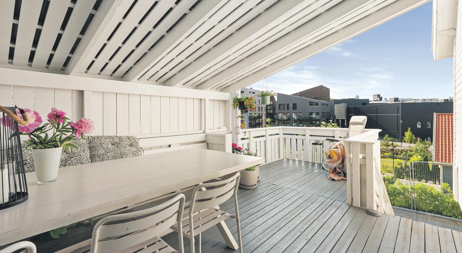 Solvendt utsikt over indre havnebasseng. Egen uteplass. Båtplasser og badehus.