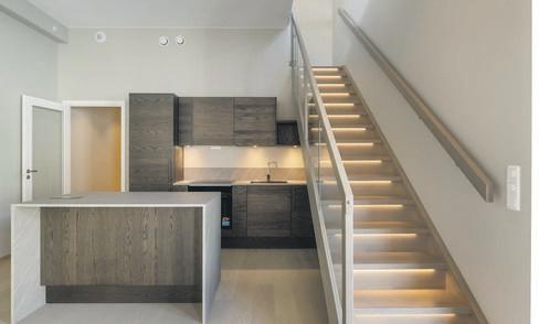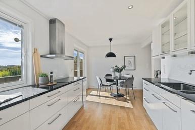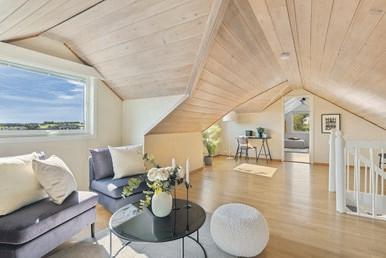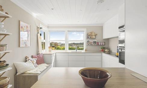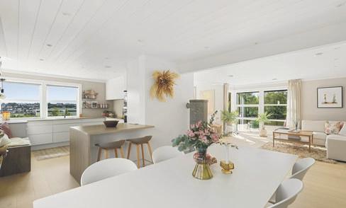 Praktisk og effektiv planløsning med åpen stue-/kjøkkenløsning med vinduer fra gulv til tak. Lysmalte flater, parkett på gulv og ekstra takhøyde på 270 cm.