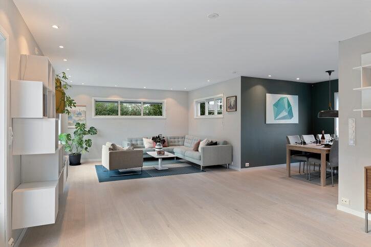 Eneboligen fremstår med stilrene farge- og materialvalg og innholdsrik planløsning. Her er det en stilfull stue med møbleringsfrihet, varmepumpe og peisovn, og kjøkkenet fra 2017 er moderne og velutstyrt. I kjelleren er det et rom med ildsted, og boligen har videre et helfliset bad/wc, et wc-rom, vaskerom og tre pene soverom. Lagringsplass finnes i kjelleren, på loftet og i garasjen.