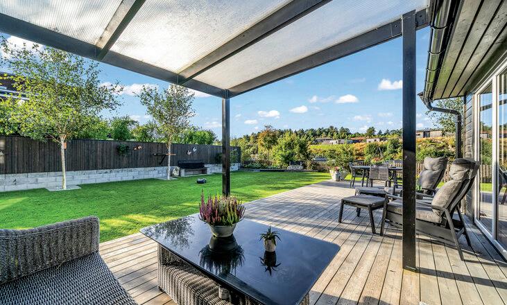 Tomten og hagen har flere soner med både plen og terrasser slik at solen kan nytes hele dagen. Praktisk utebod av god størrelse.