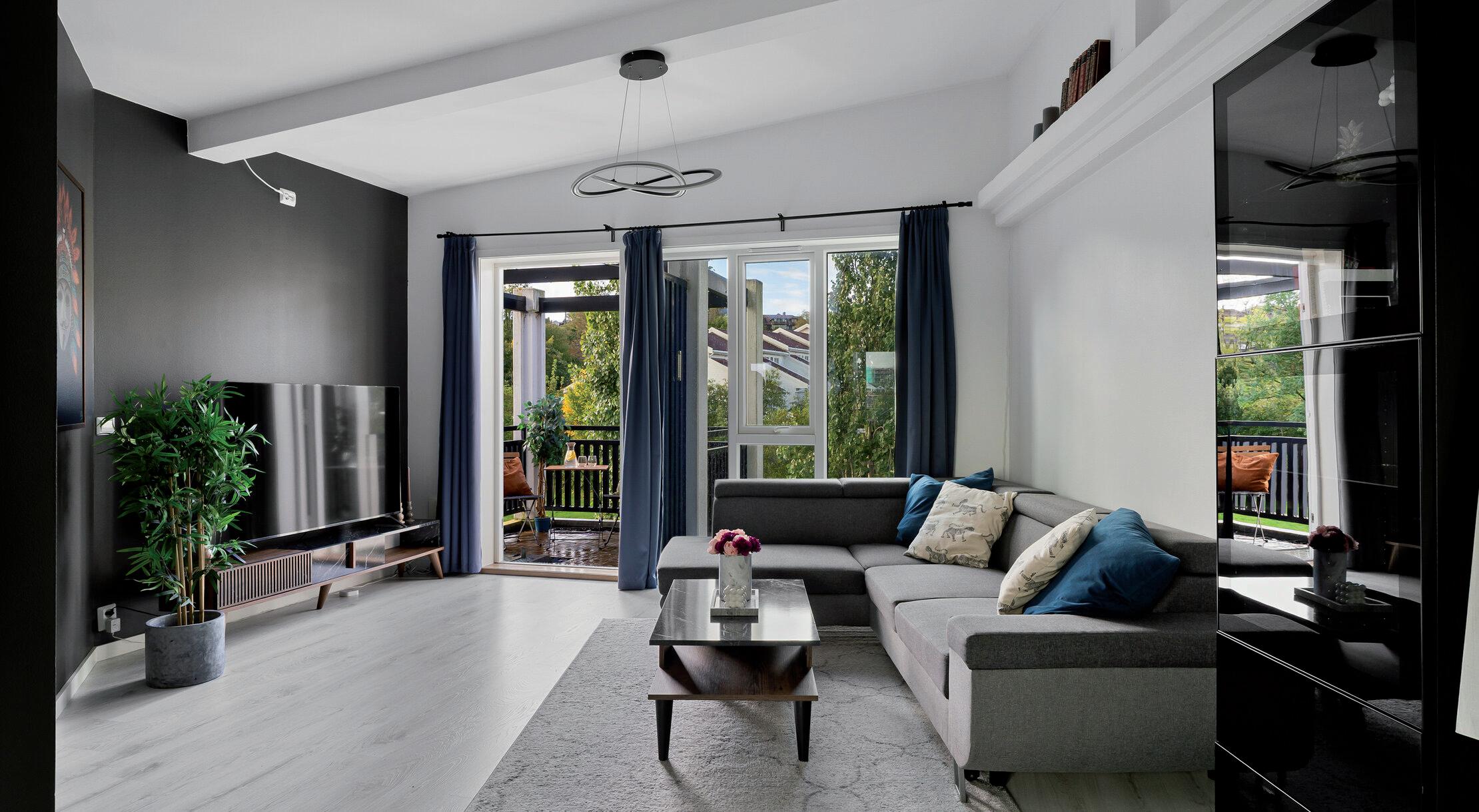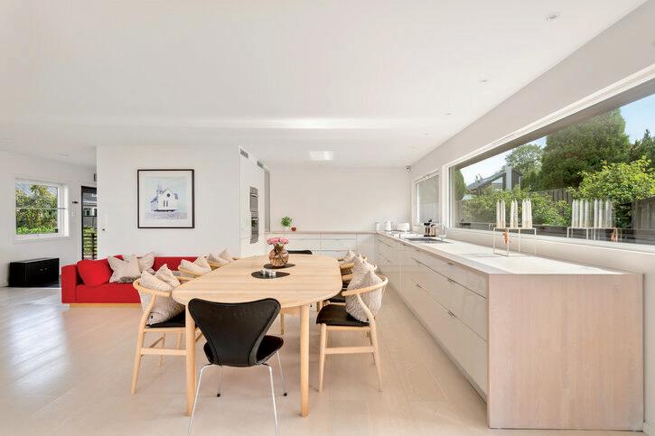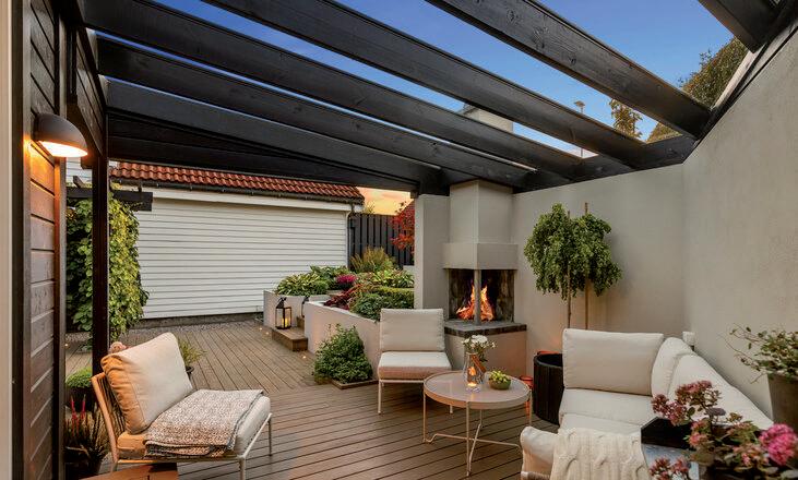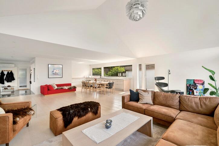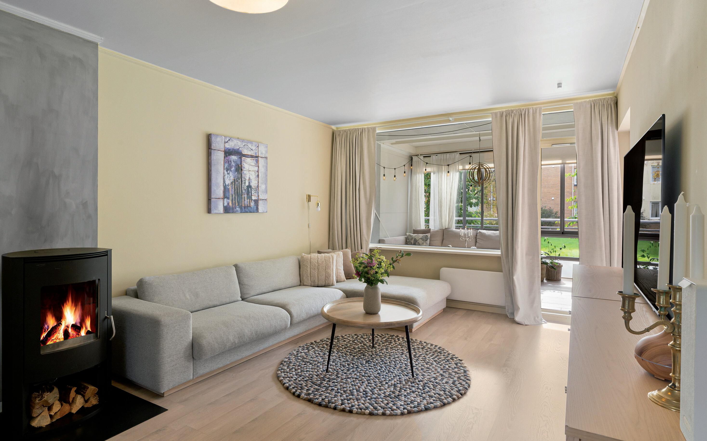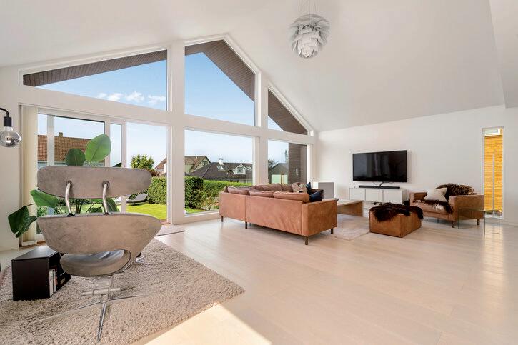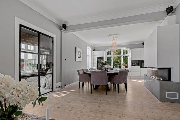 - Lys og åpen hovedetasje med store vindusflater og en lekker, moderne gasspeis som hjertet i stuen.