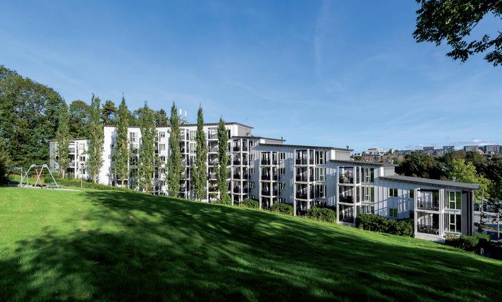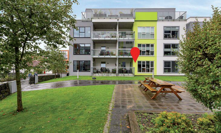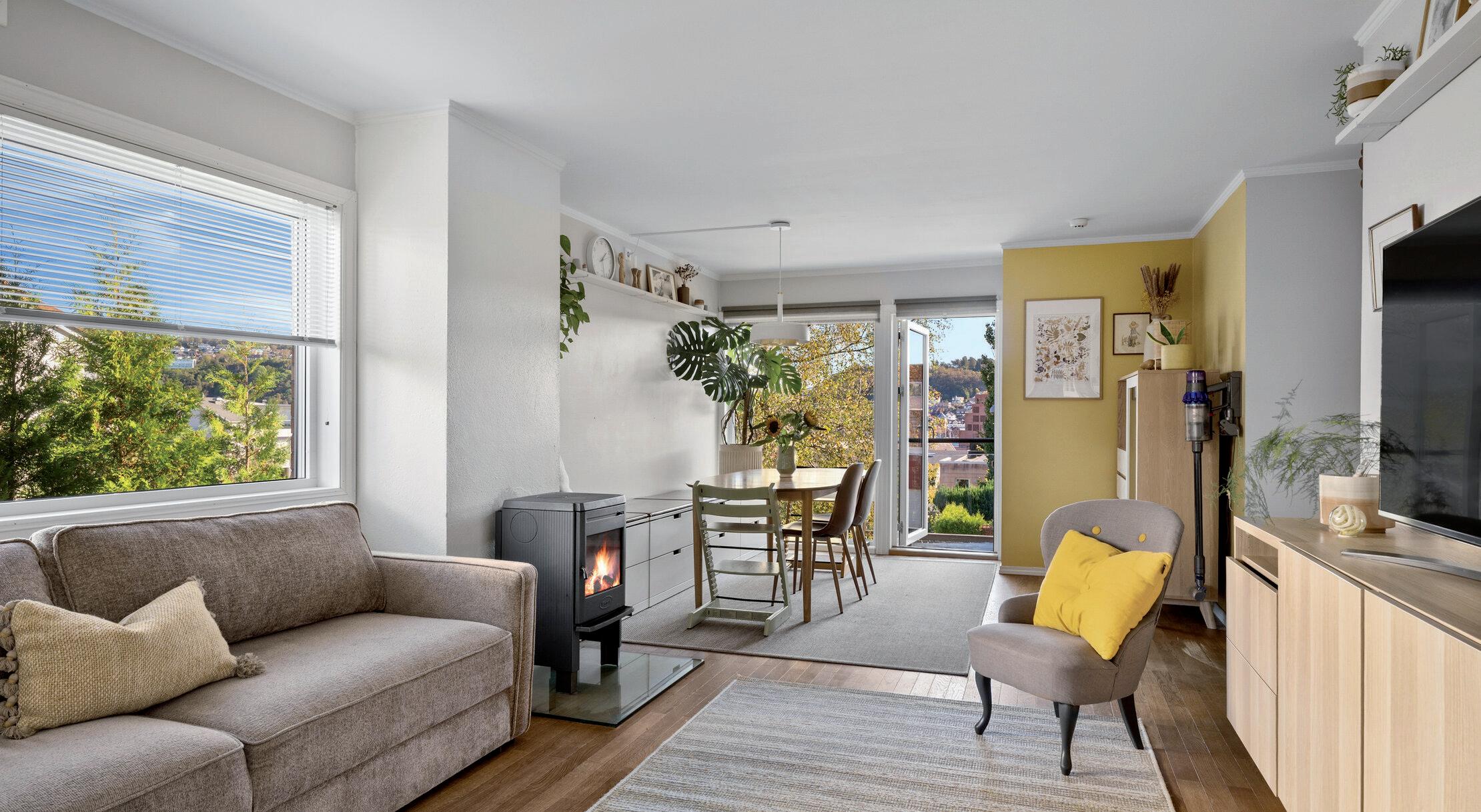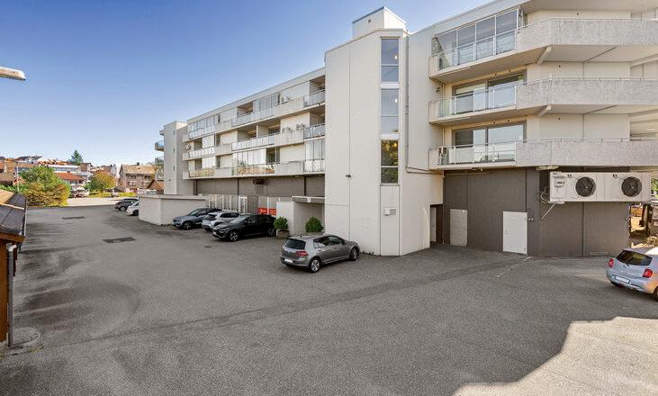 Innbydende, tilbaketrukket sentrumsleilighet m/2 soverom. Solrikt/utsikt. Garasje m/lader. Et par min å gå til tog/buss.