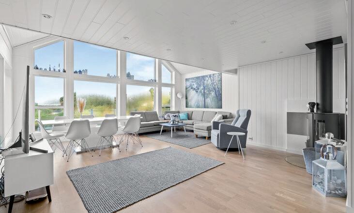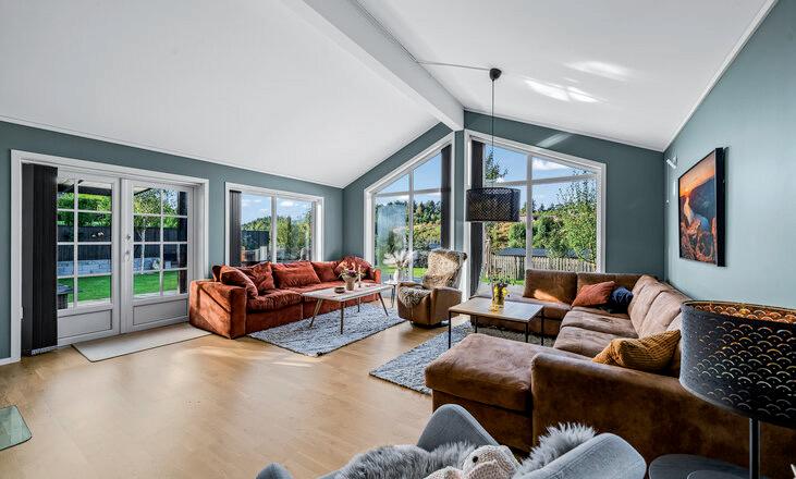 * Fin og romslig stue med gode vindusflater. Moderne peis.