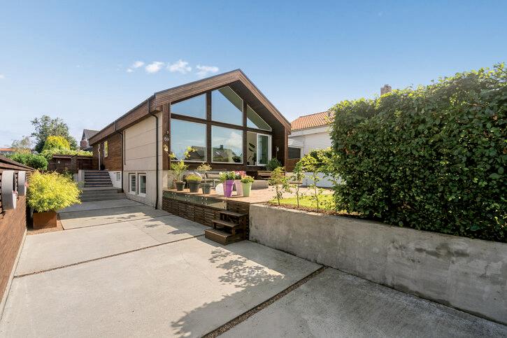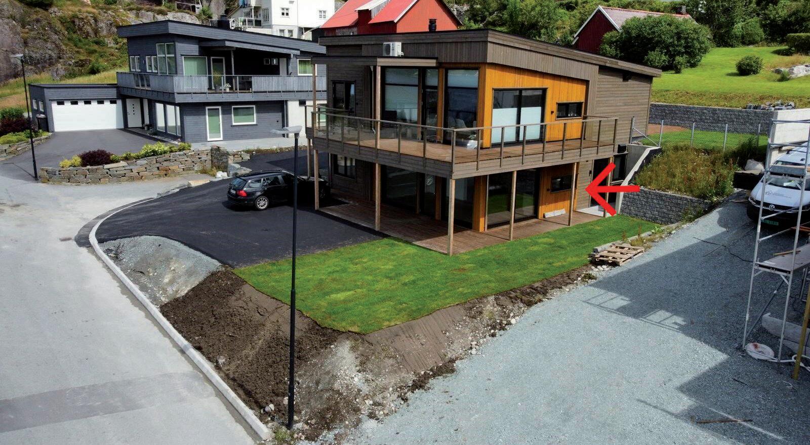 Meget flott og profesjonelt opparbeidet uteområdet med skifer. Nye porter med porttelefon. Hagesue og drivhus (ikke byggemeldt) God plass til parkering til flere biler både innenfor og utenfor port og gjerde. Elbil-lader.