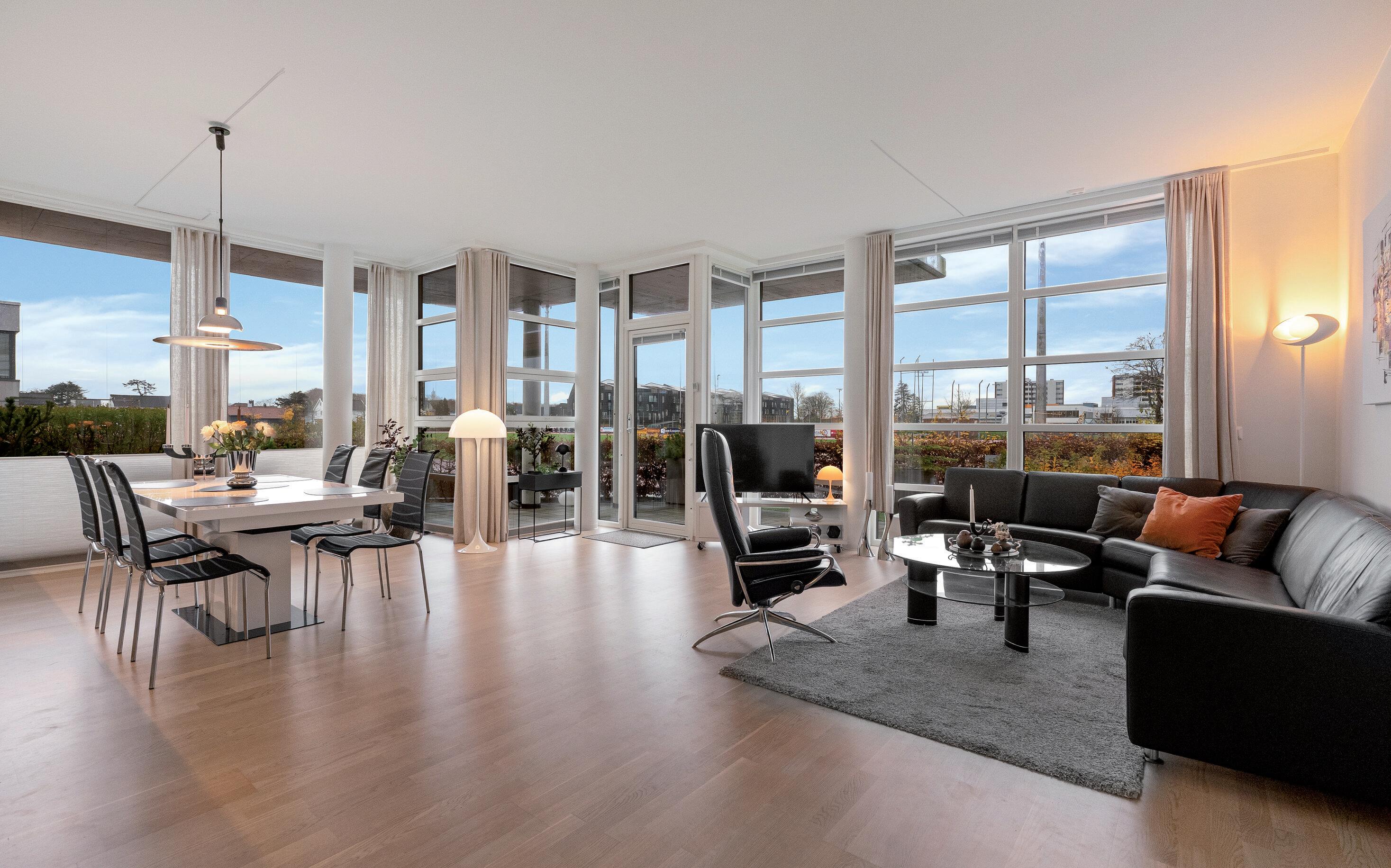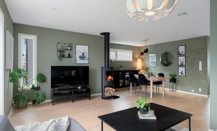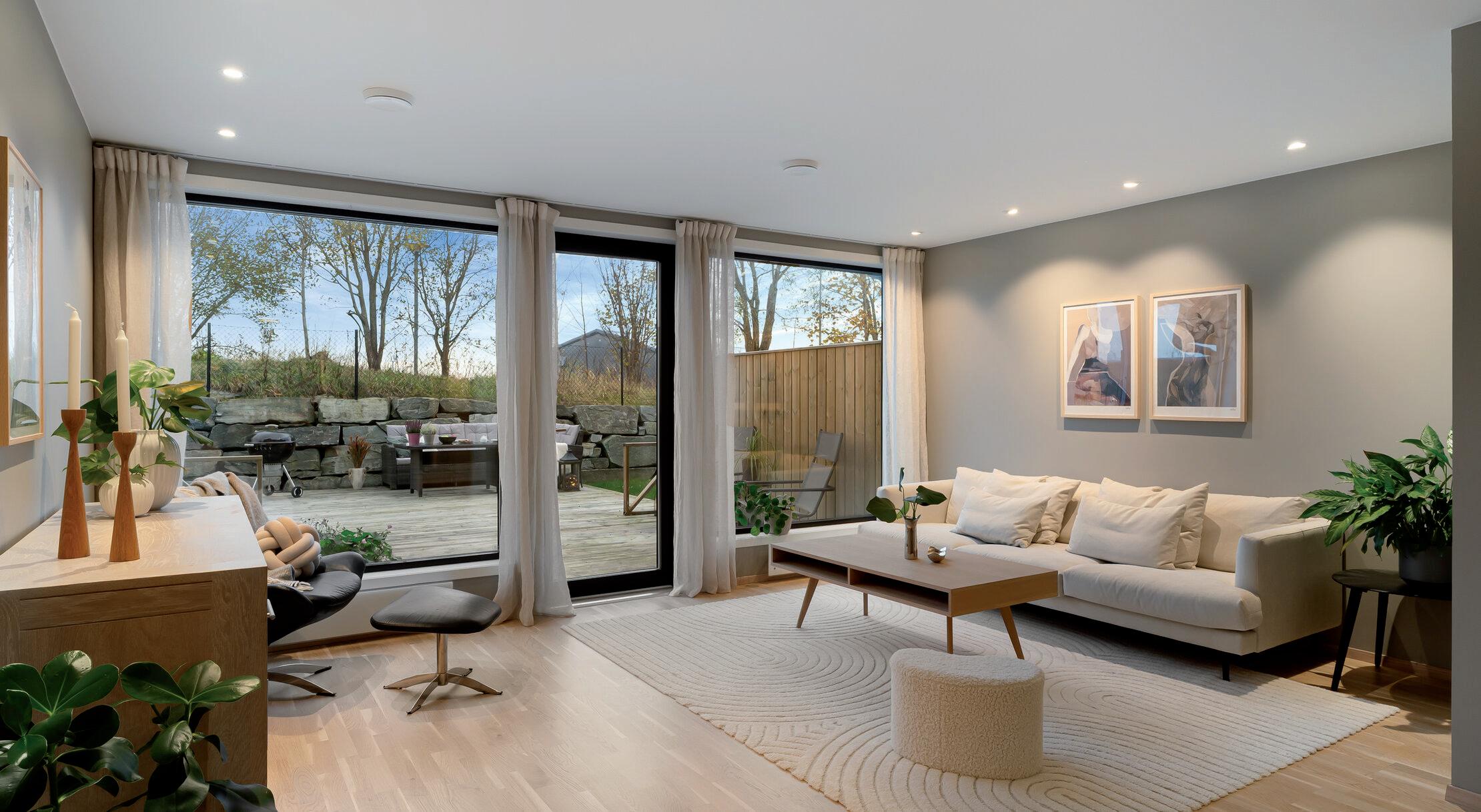- Stuen fremstår lys og romslig, med god (2,9 m) takhøyde og stor glassfasade på to vegger