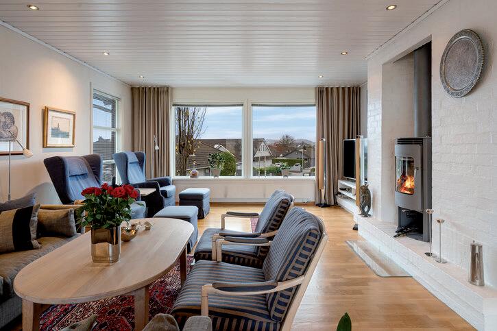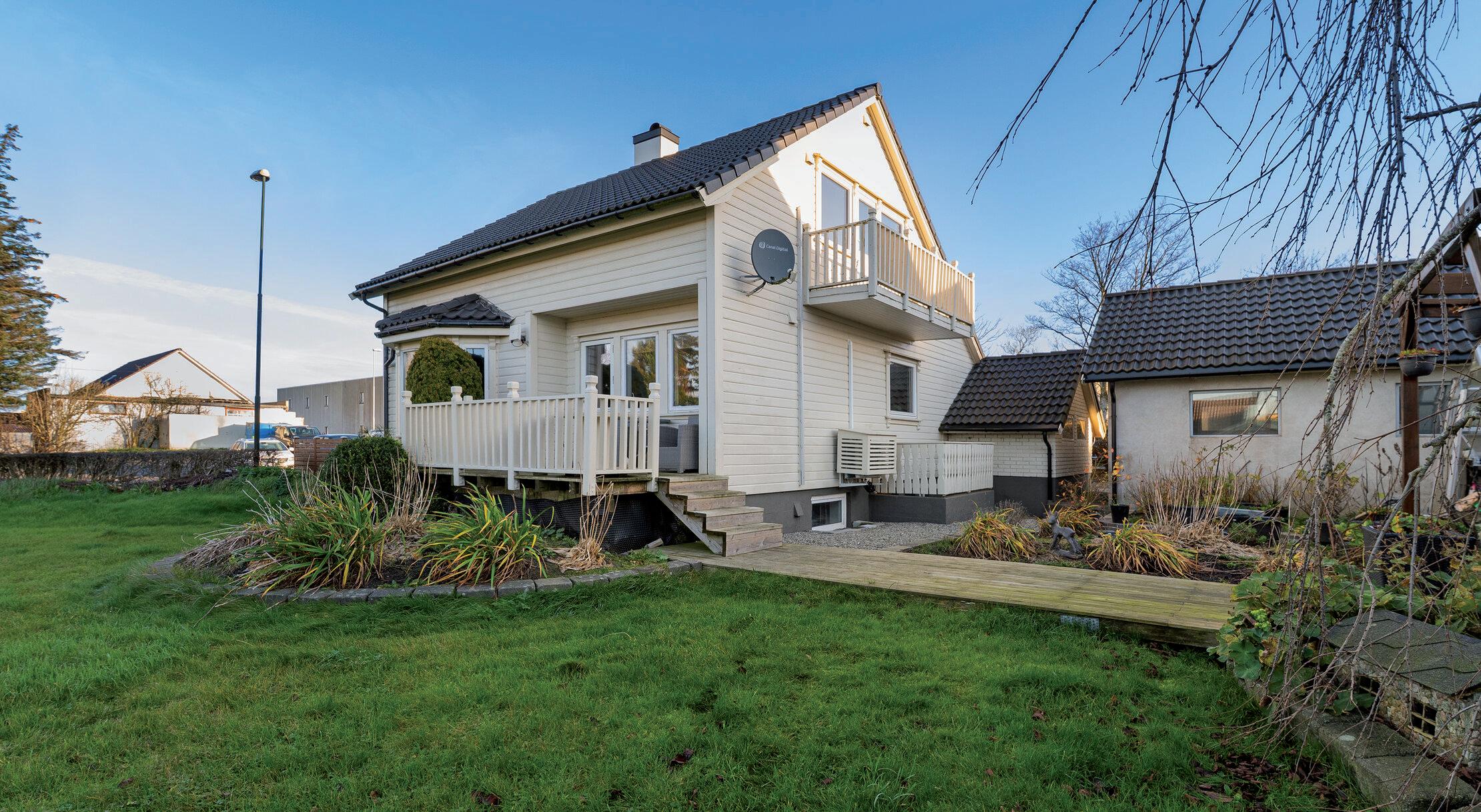 Solrik, skjermet hage m/store terrasser.En smart utformet enebolig på to gode plan. Oppgradert m/bl.a: Ny kledning og takpanner i 2019. Nytt bad og gjestetoalett i 2020. Gjennomgått og oppgradert el. anlegg i 2009. Nesten alle vindu skiftet. Ny heltre trapp inne, varmepumpe, moderne peisovner begge etg, oppgradert våtromsvinyl vaskerom m.m.