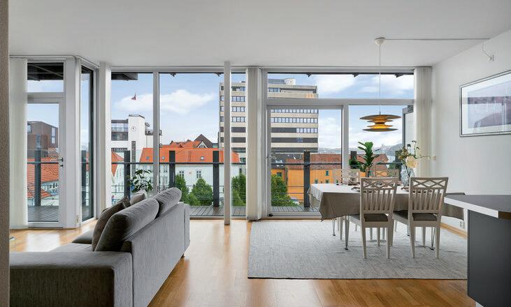 Tiltalende leilighet med 2 soverom og flott utsikt mot by, fjord og fjell. Ypperlig beliggenhet midt i Stavanger sentrum, med gangavstand til alle byens fasiliteter.