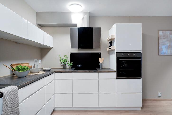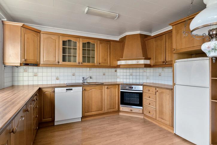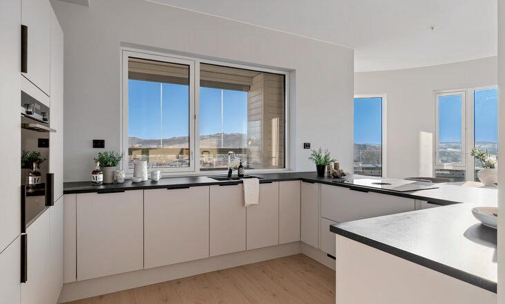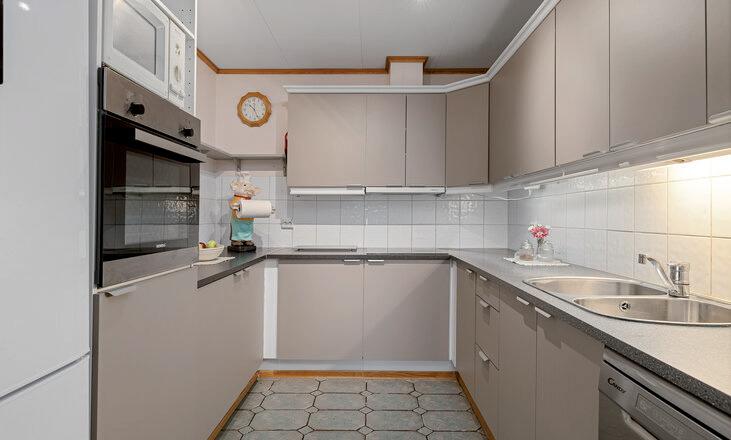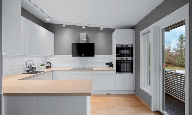 - Lekkert kjøkken med integrerte hvitevarer og svært god plass til spisebord