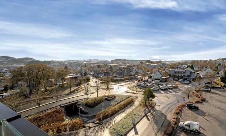 Sørvendt balkong med gode solforhold og fin utsikt over grøntområde.