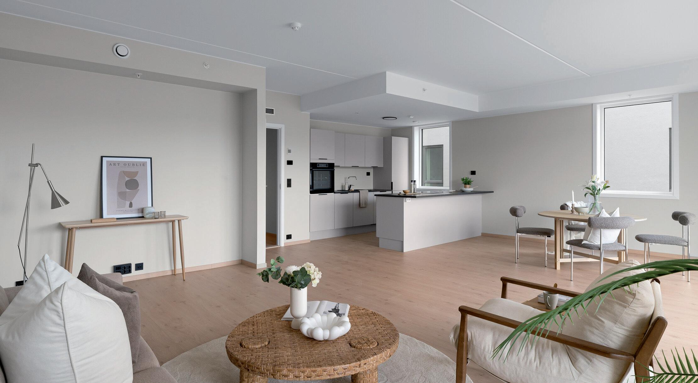 - Hele leiligheten er malt opp i lyse og moderne farger.