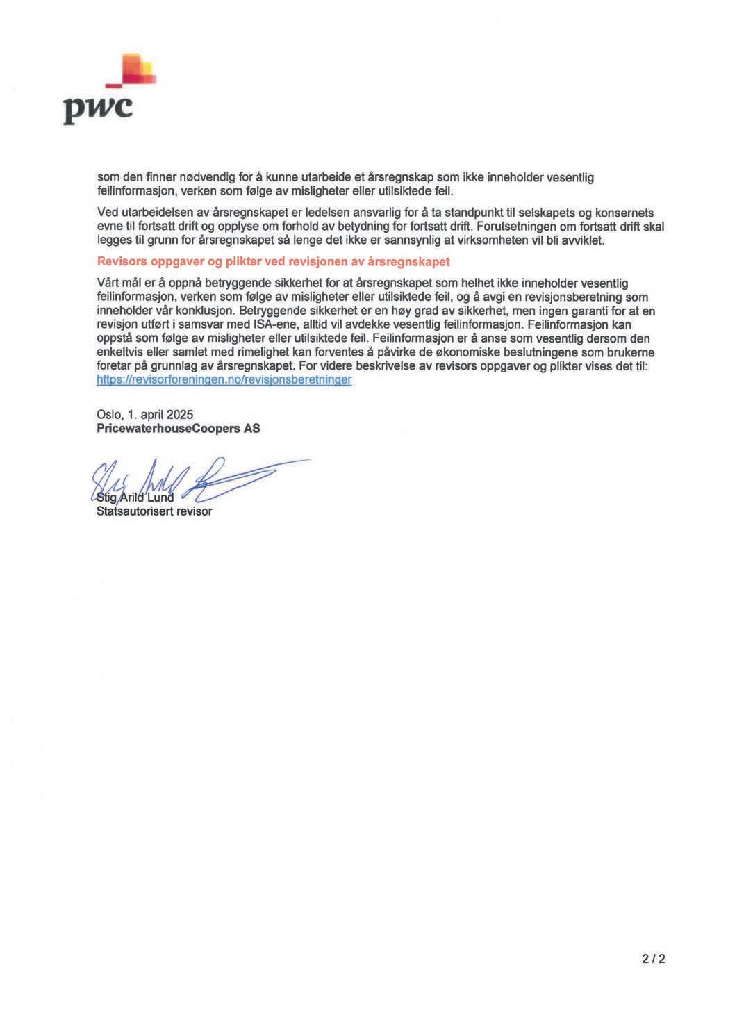 3) Avsatt ordinært utbytte kr 10,50 per aksje. Verdijustert egenkapital inkludert avsatt utbytte er kr 627 per aksje per 31.12.2024.