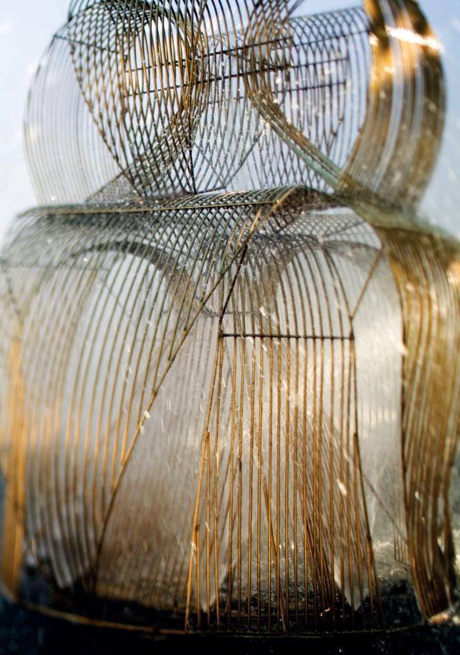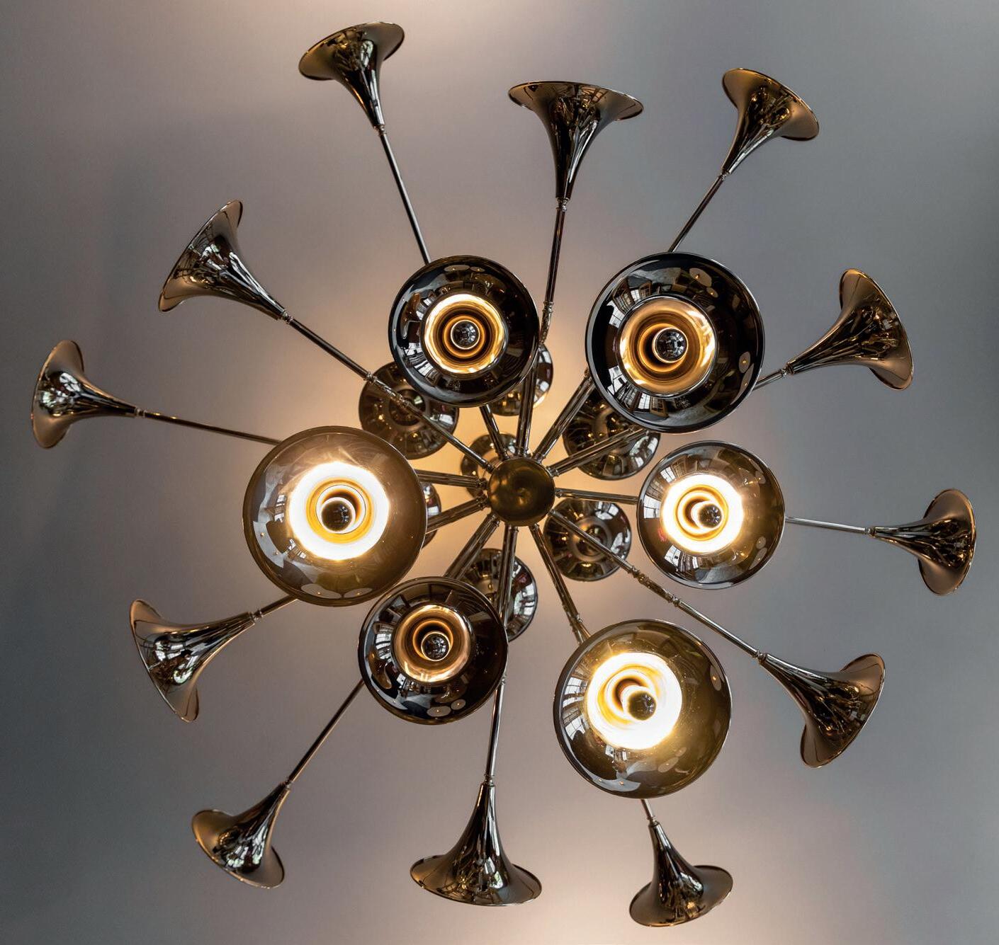 Denne dekorative trompetlampen henger i foajeen og er designet av interiørarkitekt Anemone Wille Waage.