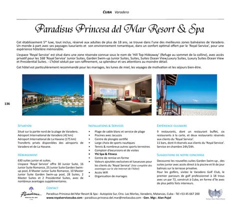 Contact Paradisus Princesa del Mar Resort & Spa - Autopista Sur, Ctra. Las Morlas, Varadero, Matanzas, Cuba - Tél +53 45 667 200 www.royalservicecuba.com - paradisus.princesa.del.mar@meliacuba.com - Gen. Mgr.: Alan Pujol