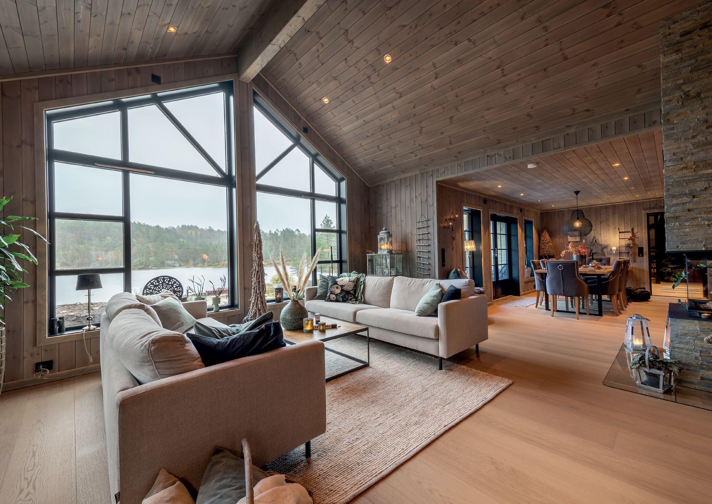 Lyset strømmer inn gjennom de store vinduene og gjør at naturen blir en del av rommet. Her er det lett å senke skuldrene og finne roen – enten det er med lange frokoster, rolige kvelder foran peisen eller gode samtaler som varer til langt på natt. En moderne hytte som gir rom for både nærhet og pusterom.