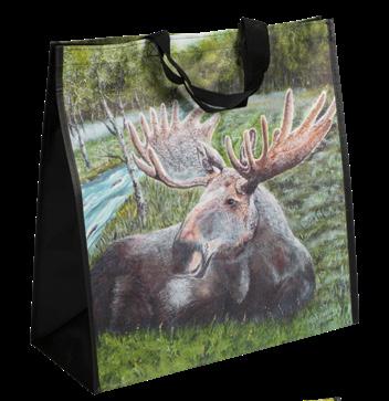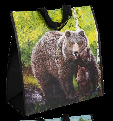 Flotte bager med motiv av kjente dyr fra den norske faunaen. De tåler tur etter tur ut i skjulet og får med seg en god slant vedkubber. Store nylonhåndtak gir god bærekomfort. Lang levetid. Velg mellom elg, hjort, gaupe og bjørn. Høyde 45 cm. Art. nr. 586