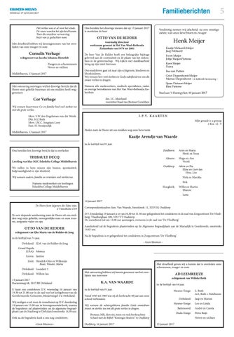 Dirksland: IJ.M. van de Ridder-de Jong Grand Rapids (USA): Monica Lieren: Jantine Zeist: Hendrik Otto en Willemijn Boaz, Wouter, Maria Dirksland: Leendert † Dirksland: Willem Jan 13 januari 2017 Boezemweg 68, 3247 BB Dirksland U kunt ons condoleren D.V. woensdag 18 januari van 19.30 tot 21.00 uur in de zaal van het kerkgebouw van de Gereformeerde Gemeente, Mozartsingel 2 te Dirksland. Wij nodigen u uit voor de rouwdienst op D.V. donderdag 19 januari om 13.30 uur in bovengenoemde kerk, waarna de begrafenis zal plaatsvinden op de algemene begraafplaats aan de Staakweg te Dirksland omstreeks 14.30 uur. Ook na de begrafenis kunt u ons nog condoleren. ~Geen bloemen~