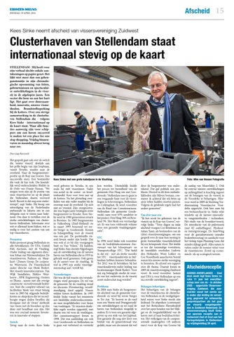 Clusterhaven van Stellendam staat internationaal stevig op de kaart STELLENDAM - Hij heeft voor zijn verhaal slechts enkele aantekeningen op papier gezet. Het lijkt niet meer dan een geheugensteuntje in zijn chronologische opsomming van feiten, gebeurtenissen en spectaculaire ontwikkelingen in de visserij in de afgelopen jaren. Een sector die hem na aan het hart ligt. Het gaat over duurzaamheid, innovatie, nieuwe vismethoden. Brandstofbeperking bij de kotters. Over een stevige samenwerking in de clusterhaven Stellendam die - volgens Kees Sinke - internationaal op de kaart staat. Waar alle functies aanwezig zijn voor schippers om een haven succesvol te maken tot een place for one stop shopping. Vrijdag binnenvaren en maandag alweer terug naar zee. Door Jaap Ruizeveld
