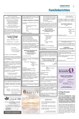 Tot het laatst wilde je leven Door een sterke wil gedreven Je geest was nog op volle kracht Maar over je lichaam had je geen macht Rust nu maar uit, je hebt je strijd gestreden Mooie herinneringen blijven in ons voortleven Bedroefd, maar dankbaar dat wij haar zo lang in ons midden mochten hebben, delen wij u mede dat, na een liefdevolle verzorging in Zorgcentrum Geldershof, is heengegaan onze allerliefste moeder, schoonmoeder, oma en overgrootmoeder