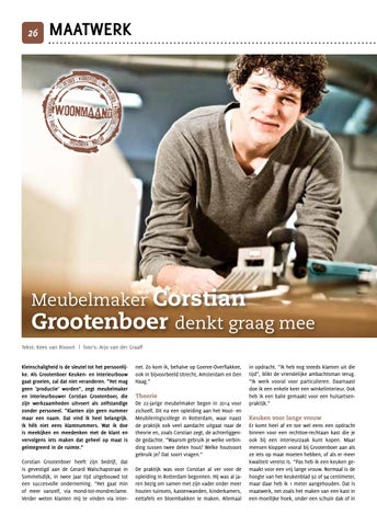 Tekst: Kees van Rixoort | foto’s: Arjo van der Graaff Kleinschaligheid is de sleutel tot het persoonlijke. Als Grootenboer Keuken- en Interieurbouw gaat groeien, zal dat niet veranderen. “Het mag geen ‘productie’ worden”, zegt meubelmaker en interieurbouwer Corstian Grootenboer, die zijn werkzaamheden uitvoert als zelfstandige zonder personeel. “Klanten zijn geen nummer maar een naam. Dat vind ik heel belangrijk. Ik héb niet eens klantnummers. Wat ik doe is meekijken en meedenken met de klant en vervolgens iets maken dat geheel op maat is geïntegreerd in de ruimte.” Corstian Grootenboer heeft zijn bedrijf, dat is gevestigd aan de Gerard Walschapstraat in Sommelsdijk, in twee jaar tijd uitgebouwd tot een succesvolle onderneming. “Het gaat min of meer vanzelf, via mond-tot-mondreclame. Verder weten klanten mij te vinden via inter-