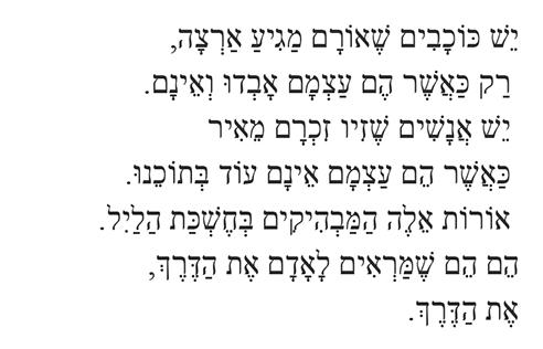 Yeish anashim sheziv zich’ram meiir kaasher heim atzmam einam od b’tocheinu. Orot eileh hamavhikim b’cheshkat halayil. Heim, heim shmarim laadam et haderech, et haderech.