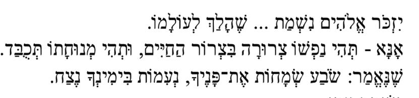 Yizkor Elohim nishmat ... sheheeleita al kanfei hash’chinah. Ana –t’hi han’shamah shel … tz’rurah bitzror hachayim, ut’hi m’nuchat hanefesh t’chubad. Sheneemar: Sova s’machot et panecha, n’imot bimin’cha netzach.