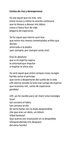 Cantos de risa y desesperanza Yo soy aquel que no más reía entre musas y ninfas la canción cortesana que te llevare a desear mis labios como si fuera fluir de vida plegaría de esperanza. Yo fui aquel que eterno azul reía que entre mis manos contemplaba anillos que decían: amarrada a la piedra ¡por siempre, por siempre serás mía! Eres lo absoluto que a mi espíritu aspira, la voluntad que impulsa a respirar el alma mía. Yo seré aquel que entre campos rosas recogía herido como el príncipe que corre a despertarte del sueño de la vida ¡Oh eterno amado tú eres ese campo de espinas que ocasiona reír, canto de esperanza perdida! ¡Oh ,yo he nacido para ver morir esta nostalgia tuya! tan cercano el labio, tan cercano el día de verte bailar con la duda desprendida ¡De que eres un ídolo, un tótem tribal fantasía! Que acerco con invocación en la despedida ¡Desprendiendo mis despojos del alma herida!