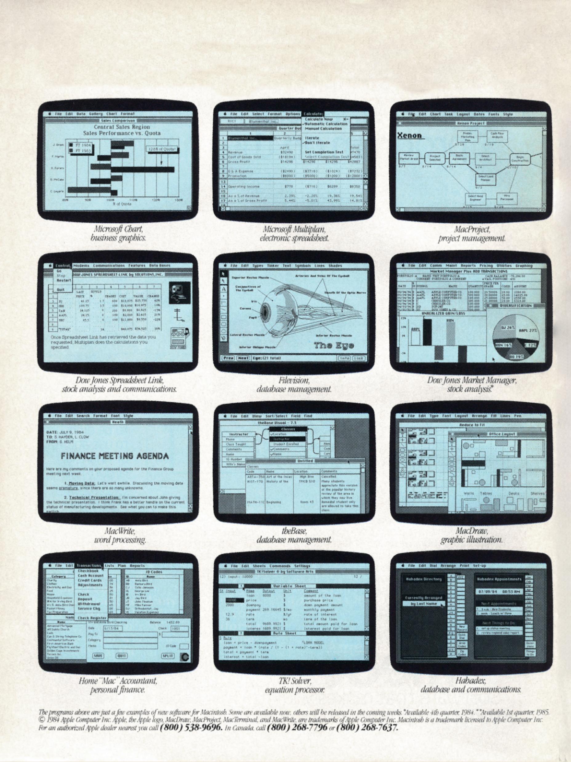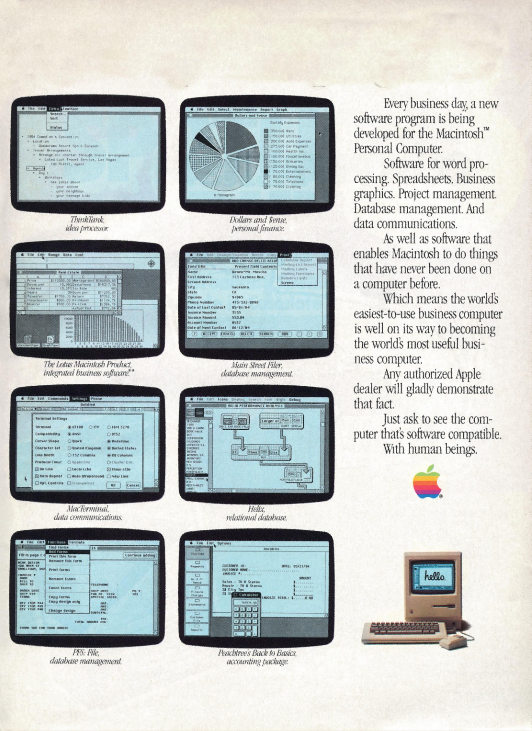 Apple’s pages felt airy, elegant, and striking — more like design spreads than typical advertisements. Take, for example, the launch ad “Introducing Macintosh. What makes it tick. And talk.” or “We interrupt this magazine for some important programs” (on the next page), which showcased a surprisingly rich variety of applications, while quietly easing fears that there might be too few.