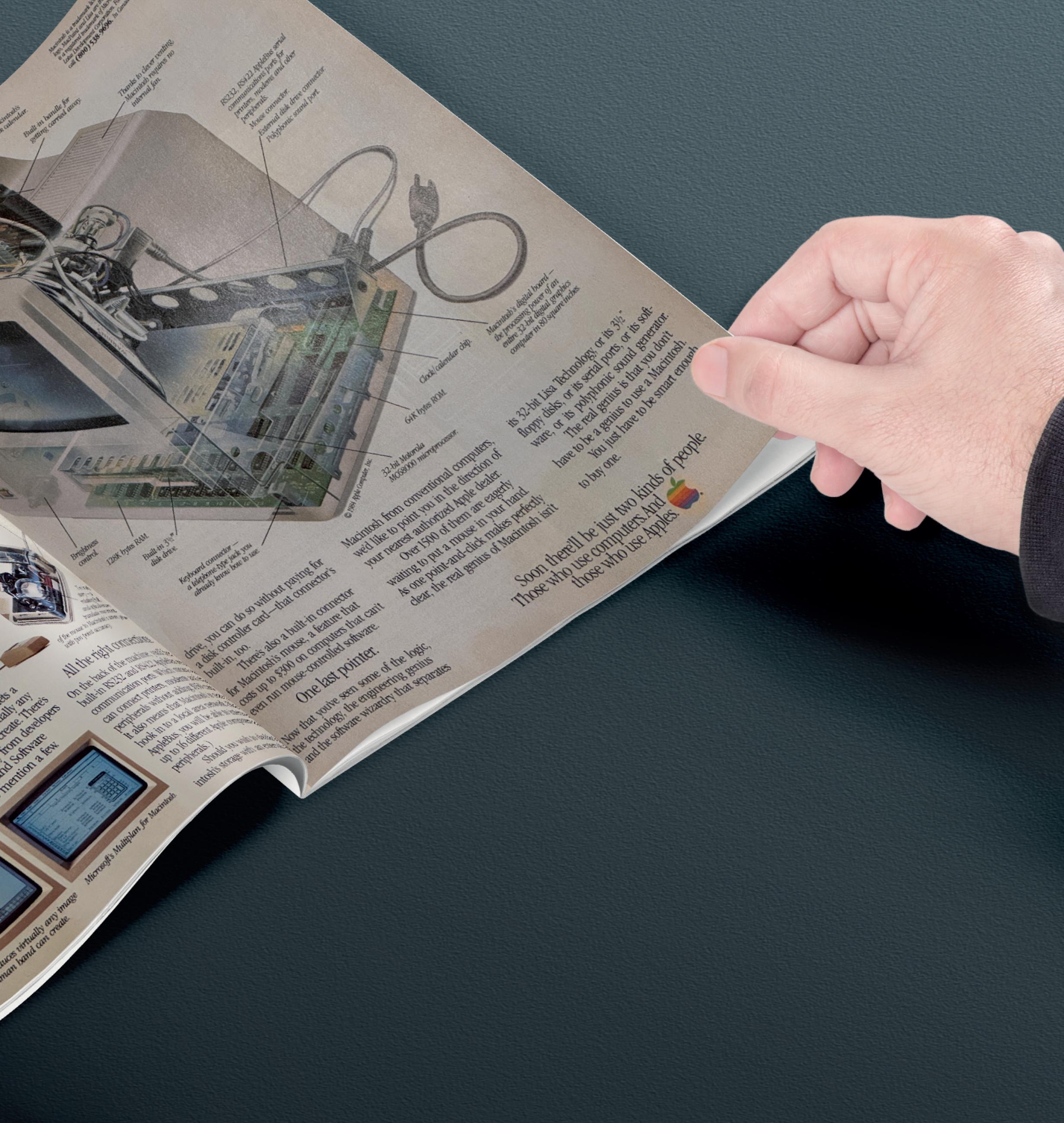 In the 1980s, computer magazines were packed with dense, technical ads — but Apple kept playing a different game, just as they had with the Apple II. Their delightful ads mixed text and graphics, speaking in clear, inviting tones that anyone could understand.