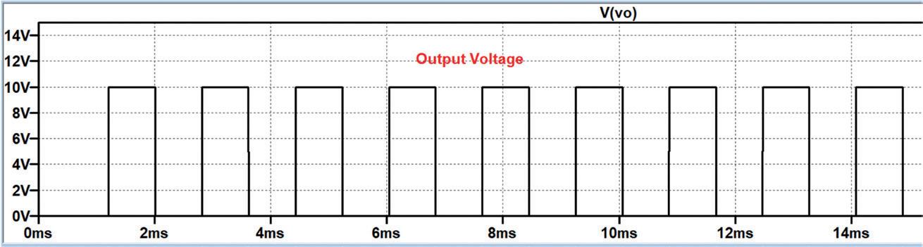 Figure 2.16 shows the LTspice schematic of the circuit. The output waveform is shown in Figure 2.17 where the duty cycle is 50%.