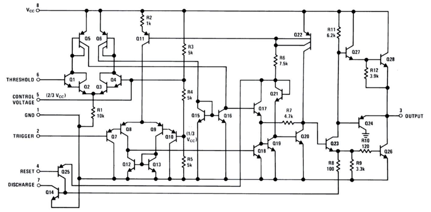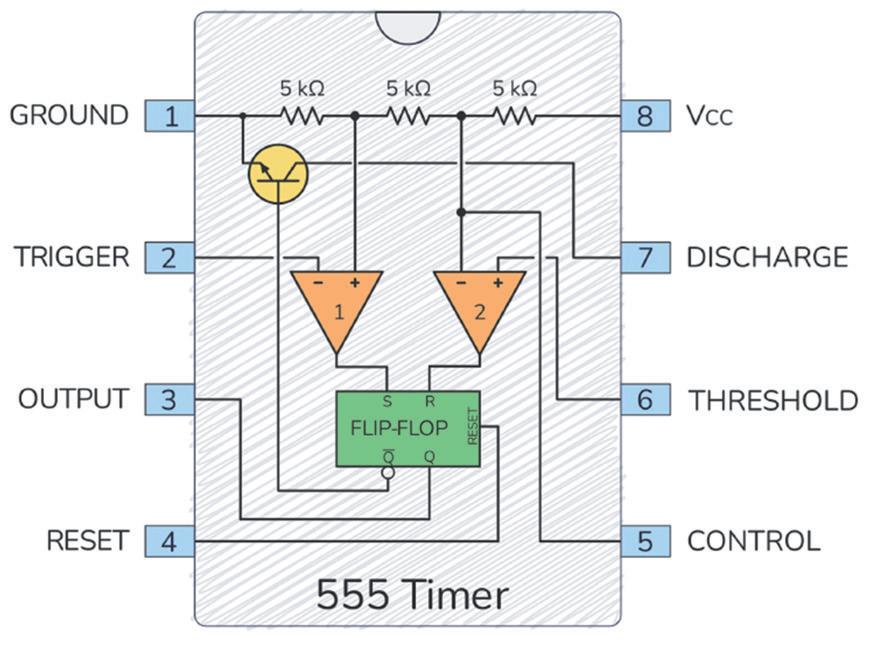 Der 555-Timer-IC, ursprünglich von Signetics um 1971 eingeführt, ist vielleicht einer der beliebtesten analogen integrierten Schaltkreise, die jemals produziert wurden. Ursprünglich als „IC Time Machine“ bezeichnet, wurde dieser Chip in zahlreichen Timerund Oszillatorprojekten von unzähligen Menschen über Jahrzehnte hinweg verwendet. Der Chip ermöglicht ein sehr kostengünstiges Design von monostabilen, astabilen und bistabilen Schaltungen mit nur wenigen externen passiven Komponenten wie Widerständen und einem Kondensator. Zusätzliche Anschlüsse sind für externes Triggern oder Zurücksetzen des Chips vorgesehen.