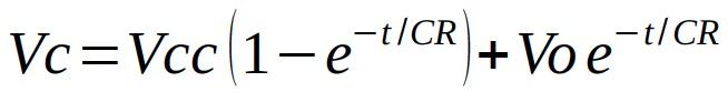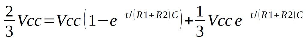 Die Periode (und damit die Frequenz) der Ausgangsspannung kann wie folgt berechnet werden. Unter der Annahme, dass die Anfangsbedingungen null sind, steigt die Spannung über einem Kondensator in einem RC-Kreis exponentiell an, wie durch die Gleichung gegeben: wobei Vc die Spannung über dem Kondensator und Vcc die angelegte Spannung ist. CR ist als Zeitkonstante des Schaltkreises bekannt. Mit t wird die Zeit bezeichnet. Im astabilen Schaltkreis ist die Anfangsspannung über dem Kondensator jedoch nicht null, sondern 1/3 Vcc. Die Gleichung, die die Spannung über dem Kondensator mit einer nicht-null-Anfangsbedingung beschreibt, lautet: wobei Vo die Anfangsspannung über dem Kondensator ist. Im astabilen Schaltkreis steigt die Spannung von 1/3 Vcc auf 2/3 Vcc. Die Gleichung für die Spannung über dem Kondensator reduziert sich dann zu: