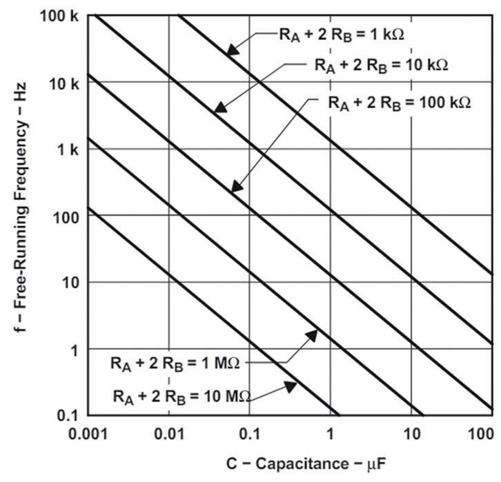 Mit einem sogenannten Nomogramm kann man die ungefähren Bauteilwerte für eine gewünschte Frequenz leicht bestimmen. In Abbildung 2.4 ist ein solches Nomogramm dargestellt, das aus dem Datenblatt des Texas Instruments NE555P stammt. Beachten Sie, dass in dieser Abbildung RA und RB den Werten R1 und R2 entsprechen, so wie sie in Abbildung 2.2 gezeigt werden.