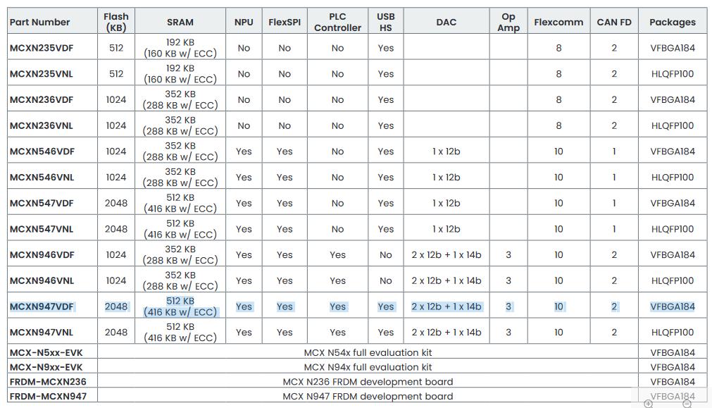 • MCX-N947 Dual Arm 32-bit Cortex-M33 cores at 150 MHz each