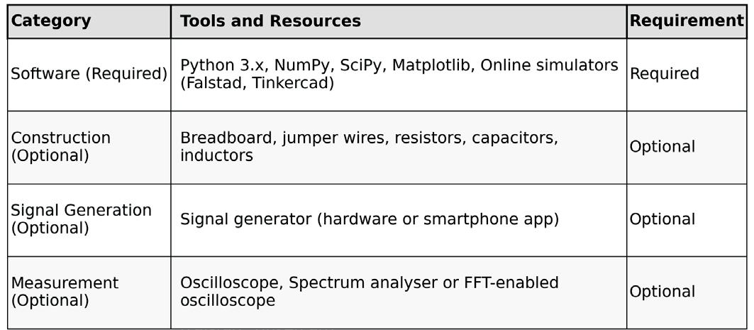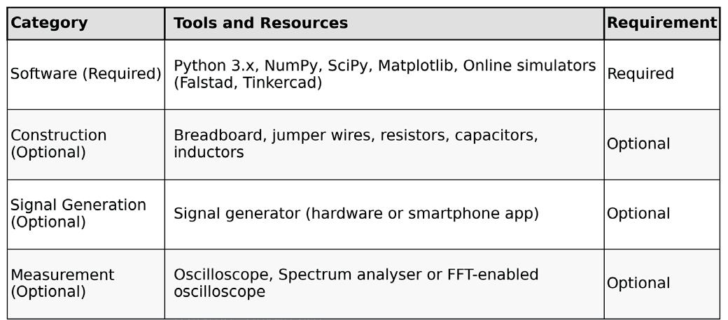 While not required, having access to basic laboratory equipment can deepen your understanding of filter behaviour by allowing you to build real circuits and measure their performance directly. Readers who have access to these tools are encouraged to use them, but they are not necessary to complete the learning objectives of this book. The following hardware tools are considered optional: