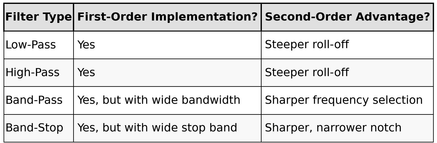 • Band-pass and band-stop filters can be implemented using first-order techniques but perform much better when built as second-order circuits, especially when narrow frequency control is important.