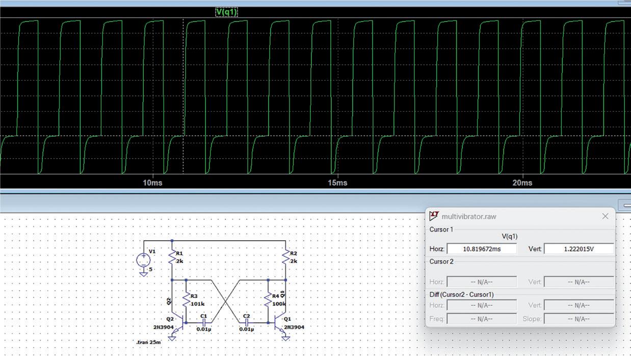 By simulating the circuit, we can display the DC and AC voltages at different parts of the circuit, plot the voltage and current waveforms and so on. In this simulation, we expect the voltage at the transistor collectors to be a square wave.