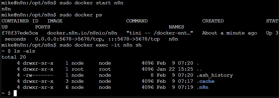 Die Anweisung baut einen Docker-Container mit dem Namen n8n. Basis ist, das Image docker.n8n.io/n8nio/n8n, das bei Bedarf heruntergeladen wird. Aus dem Container wird der Port 5678 mit der gleichen Nummer und der Pfad /home/node/.n8n auf den Pfad /opt/n8n herausgeführt. Die Bedeutung der beiden Argumente ist: