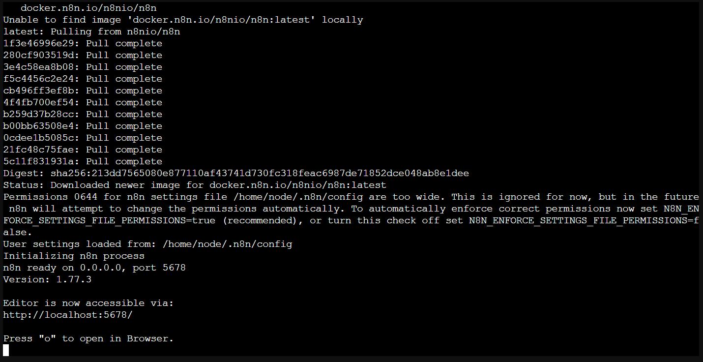sudo docker run -it --rm --name n8n\ -p 5678:5678\ -v /opt/n8n:/home/node/.n8n\ docker.n8n.io/n8nio/n8n