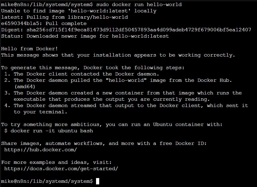 Wenn der Test mit hello-world erfolgreich verlief, kann als nächstes n8n installiert werden.