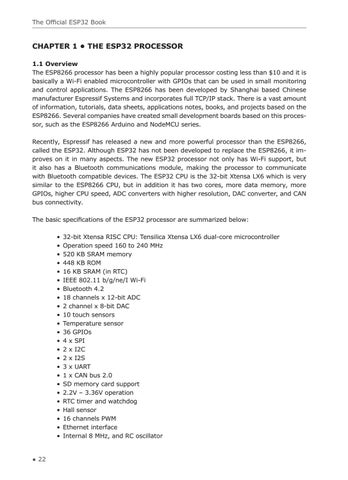 CHAPTER 1 • THE ESP32 PROCESSOR 1.1 Overview The ESP8266 processor has been a highly popular processor costing less than $10 and it is basically a Wi-Fi enabled microcontroller with GPIOs that can be used in small monitoring and control applications. The ESP8266 has been developed by Shanghai based Chinese manufacturer Espressif Systems and incorporates full TCP/IP stack. There is a vast amount of information, tutorials, data sheets, applications notes, books, and projects based on the ESP8266. Several companies have created small development boards based on this processor, such as the ESP8266 Arduino and NodeMCU series. Recently, Espressif has released a new and more powerful processor than the ESP8266, called the ESP32. Although ESP32 has not been developed to replace the ESP8266, it improves on it in many aspects. The new ESP32 processor not only has Wi-Fi support, but it also has a Bluetooth communications module, making the processor to communicate with Bluetooth compatible devices. The ESP32 CPU is the 32-bit Xtensa LX6 which is very similar to the ESP8266 CPU, but in addition it has two cores, more data memory, more GPIOs, higher CPU speed, ADC converters with higher resolution, DAC converter, and CAN bus connectivity. The basic specifications of the ESP32 processor are summarized below: • 32-bit Xtensa RISC CPU: Tensilica Xtensa LX6 dual-core microcontroller • Operation speed 160 to 240 MHz • 520 KB SRAM memory • 448 KB ROM • 16 KB SRAM (in RTC) • IEEE 802.11 b/g/ne/I Wi-Fi • Bluetooth 4.2 • 18 channels x 12-bit ADC • 2 channel x 8-bit DAC • 10 touch sensors • Temperature sensor • 36 GPIOs • 4 x SPI • 2 x I2C • 2 x I2S • 3 x UART • 1 x CAN bus 2.0 • SD memory card support • 2.2V – 3.36V operation • RTC timer and watchdog • Hall sensor • 16 channels PWM • Ethernet interface • Internal 8 MHz, and RC oscillator