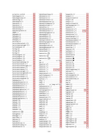navigation symbols . . . . . . . \nbackapprox (̸) . . . . . . . . \nbackapproxeq (̸) . . . . . . . \nbackcong (≌̸) . . . . . . . . . . \nbackeqsim (̸) . . . . . . . . . \nbacksim (*) . . . . . . . . . . . \nbacksim (∽̸) . . . . . . . . . . . \nbacksimeq (+) . . . . . . . . . \nbacksimeq (⋍̸) . . . . . . . . . \nbacktriplesim (̸) . . . . . . \NBSP ( ) . . . . . . . . . . . . . . \nBumpeq ()) . . . . . . . . . . . . \nBumpeq (≎̸) . . . . . . . . . . . . \nbumpeq (() . . . . . . . . . . . . \nbumpeq (≏̸) . . . . . . . . . . . . \ncirceq (≗̸) . . . . . . . . . . . . \ncirclearrowleft (↺̸) . . . \ncirclearrowright (↻̸) . . \nclosedequal (̸) . . . . . . . \ncong ( ) . . . . . . . . . . . . . \ncong ( ) . . . . . . . . . . . . . \ncong (≇) . . . . . . . . . . . . . \ncurlyeqprec (¸) . . . . . . . \ncurlyeqprec (⋞̸) . . . . . . . \ncurlyeqsucc (¹) . . . . . . . \ncurlyeqsucc (⋟̸) . . . . . . . \ncurvearrowdownup (̸) . . . \ncurvearrowleft (↶̸) . . . . \ncurvearrowleftright (̸) \ncurvearrownesw (̸) . . . . \ncurvearrownwse (̸) . . . . \ncurvearrowright (↷̸) . . . . \ncurvearrowrightleft (̸) \ncurvearrowsenw (̸) . . . . \ncurvearrowswne (̸) . . . . \ncurvearrowupdown (̸) . . . \ndasharrow (⇢̸) . . . . . . . . . \ndasheddownarrow (⇣̸) . . . . \ndashedleftarrow (⇠̸) . . . . \ndashednearrow (̸) . . . . . \ndashednwarrow (̸) . . . . . \ndashedrightarrow (⇢̸) . . . \ndashedsearrow (̸) . . . . . \ndashedswarrow (̸) . . . . . \ndasheduparrow (⇡̸) . . . . . . \ndashleftarrow (⇠̸) . . . . . \ndashrightarrow (⇢̸) . . . . \nDashV (+) . . . . . . . . . . . . \nDashv (+) . . . . . . . . . . . . \ndashV (/) . . . . . . . . . . . . \ndashv (') . . . . . . . . . . . . \ndashv (⊣̸) . . . . . . . . . . . . \ndashVv (/) . . . . . . . . . . .