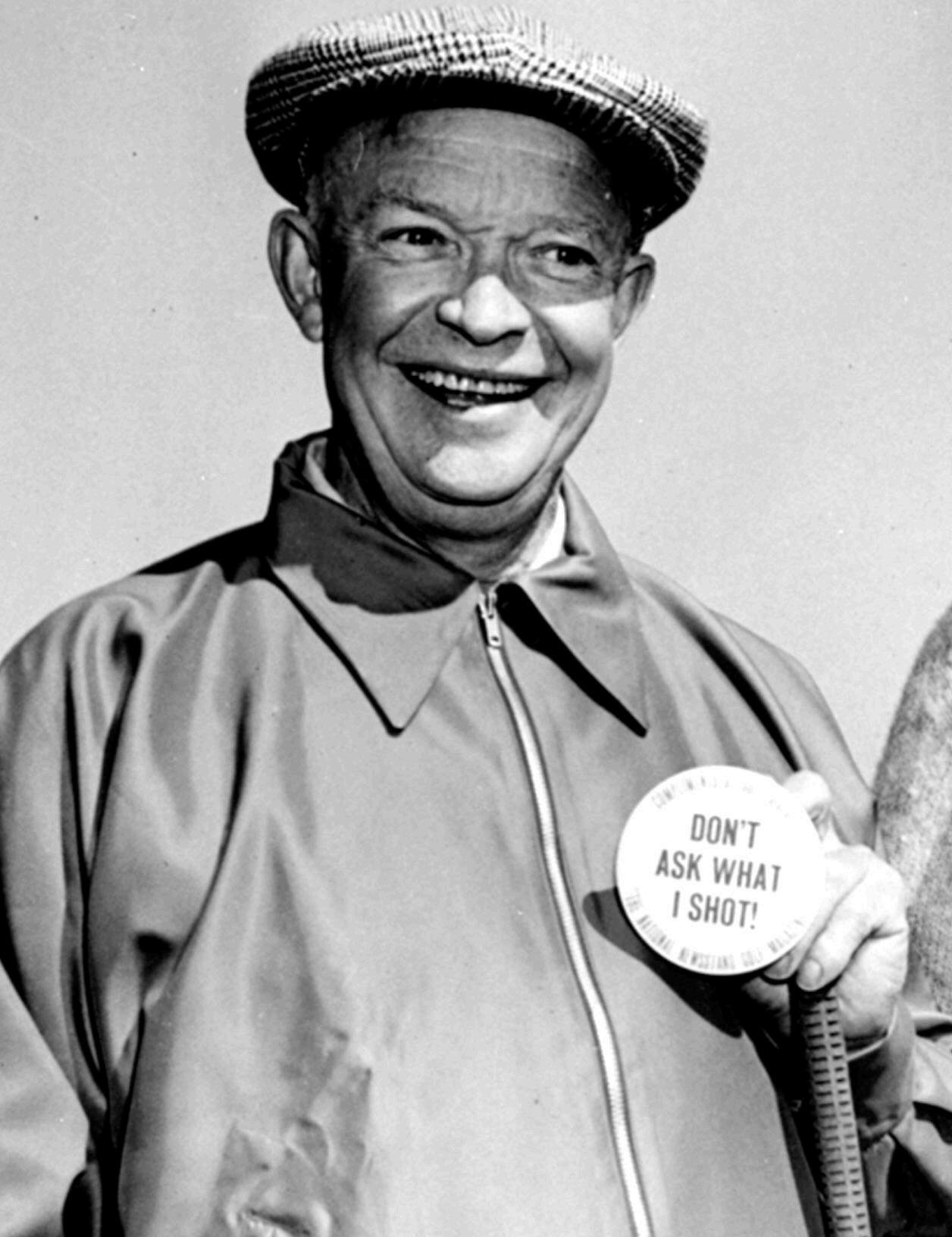 As a President and avid golfer, Ike was constantly asked what he scored, causing him to say in jest, "There ought to be a law against asking a person what he shot.” Golf Digest magazine responded by sending him lapel buttons that said "DON'T ASK WHAT I SHOT!" and by making him Member No. 1 of the “Secret Shooters' Society for the Suppression and Silencing of Scores.” Ike liked to golf so much he had a practice green installed on the White House lawn in 1954, and he left a trail of spike marks on the floor of the Oval Office! Students will practice their own putting skills and/or apply some basic geometry to create their own putt-putt holes.