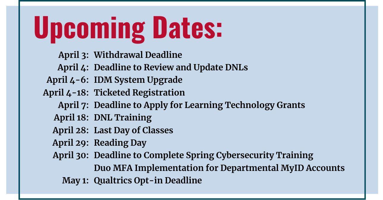 Review and Update Your DNLs by April 4, 2025: EITS is conducting its annual audit of Departmental Network Liaisons (DNLs) to ensure every school, college, and unit has designated contacts for network and security incidents. DNLs are IT professionals who serve as the primary contacts with EITS for network and security-related issues. In March, vice presidents, deans, department heads, and IT directors will receive a memo requesting that they review their assigned DNLs and make any necessary updates. Changes should be submitted via the Departmental Network Liaisons (DNL) form at itsupport.uga.edu, and confirmation that no updates are needed can be sent to infosec@uga.edu. Departments will have until April 4, 2025, to complete the audit in compliance with University System of Georgia policies. EITS will conduct an online training session for all DNLs on Friday, April 18, 2025, with the time to be announced later. For more information, please contact Ben Myers at bmyers@uga.edu