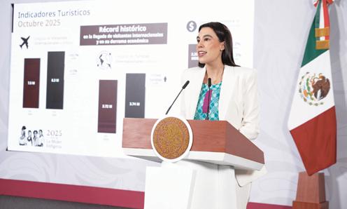 MÉXICO CERRÓ OCTUBRE con un repunte histórico en su actividad turística, consolidando máximos en llegada de visitantes y derrama económica. La secretaria de Turismo, Josefina Rodríguez, informó que el mes registró 8.3 millones de visitantes internacionales, 10.7% más que en 2024 y 2.3% arriba del nivel previo a la pandemia. La derrama superó los 2 mil 440 millones de dólares, un avance anual de 9.3 por ciento.